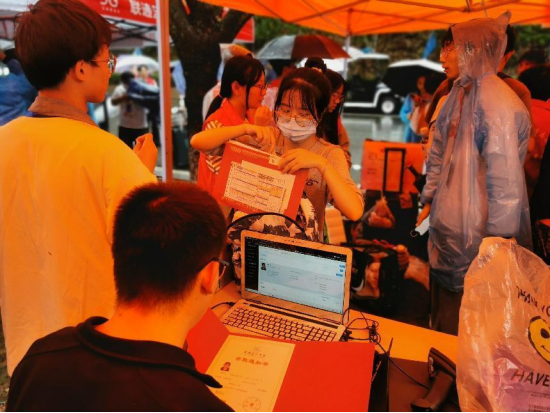 报到当天,机械学院迎新台于6点半前就布置到位,院党委书记徐柳根、院党委副书记李克明亲临现场,指导迎新工作。尽管大雨滂沱,但现场扫码登记、核验身份、信封发放等工作都有条不紊地进行。