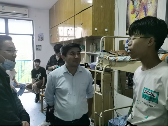 下午,学院领导走进新生宿舍,关心新生入学感受,询问需求,叮嘱同学们初入大学要注意防电信诈骗,安全第一,发现任何异常都要立即向辅导员老师反映。在发现宿舍照明昏暗等问题后,学院领导也及时向学校后勤反馈,立即帮助解决。