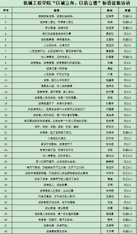 全院师生积极响应,踊跃组织参加,征集而来的标语络绎不绝,共收到原创标语116条,每一位参与者都用自己的真情文字表达自己的真切心声,有铿锵有力的誓词,底蕴十足的诗句,语气婉转的劝告,耳熟能详的警示,通俗明了的口语……每个标语作品用词简洁明了,朗朗上口,易于传颂,不仅展现了同学们的才华,也通过参与活动增强了诚信意识。经过层层评选,车212唐伯虎的“最终谎言人生无法开出灿烂鲜花”,机器211周建国的“失去了真,同时也失去了美”,机215孔溪溪的“美丽的外貌终究老去,唯有诚信的信念得以永存”及机216陶斯雨的“以诚为花,绽放信仰芬芳”这4条标语因立意深刻,被评为优秀诚信标语。(撰稿:费白露 张敏 审核:李克明)