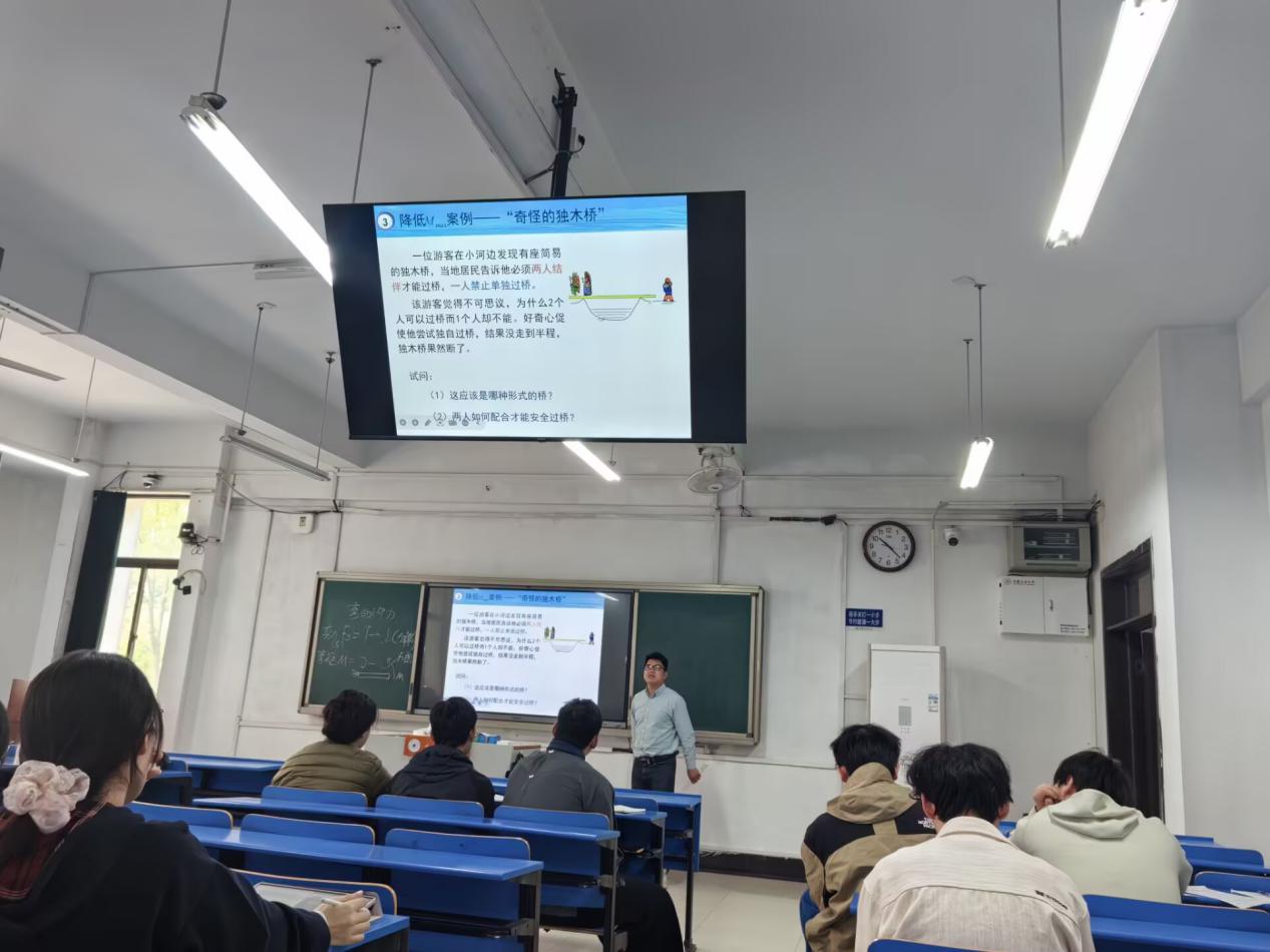 胡文锋老师主讲课程为《工程力学B》,内容聚焦“提高梁弯曲强度的措施”。课堂上,主讲教师紧扣专业知识点,将思政教育巧妙融入教学全过程,实现“知识传授”与“价值塑造”的有机统一。为激发学生学习兴趣,通过“奇怪的独木桥”案例引入,要求学生思考为何“单人过桥断裂、两人结伴安全”作为切入点,引导学生结合静定梁三种基本形式,分析弯矩变化并自主推导解决方案,得出“外伸梁结构+分跨内外配合”的结论,进一步围绕弯曲正应力公式及强度条件,通过层层设问引导学生深入理解提高梁弯曲强度的核心措施——降低最大弯矩和增大抗弯截面模量。教学过程中,胡老师注重引导学生主动思考、合作探究,既培养其逻辑推理和工程实际问题解决能力,又借案例传递团结协作理念,让学生体会到科学配合的重要性。总结环节,教师梳理知识点,强调合理布置载荷、安排支座的意义,结合实践引导学生认识专业价值,激发精益求精的工匠精神,厚植家国情怀,强化职业担当。